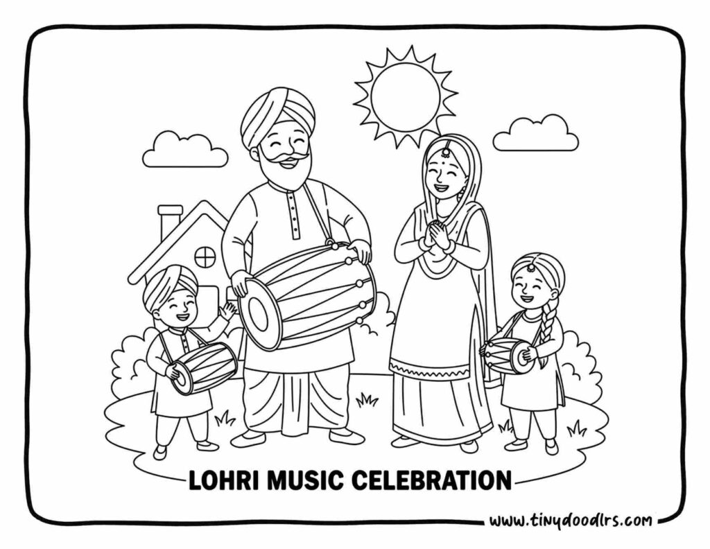 This type of beautiful Lohri drawing helps kids connect art with real-life learning, making the festival more memorable. It also fits perfectly into school projects, classroom decorations, and coloring page collections, especially when combined with bonfire and dhol drawings.