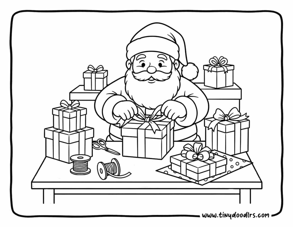 3. Santa Wrapping Gifts with Ribbon