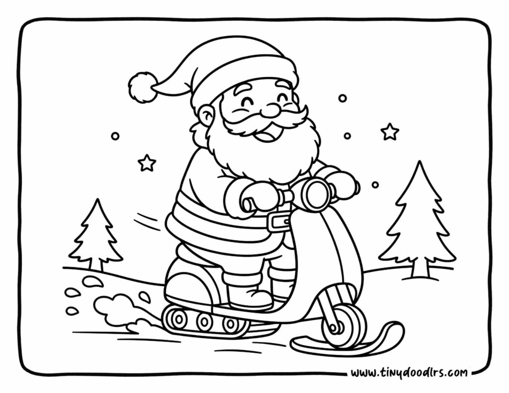 Santa zooming through snow on a fun winter scooter.