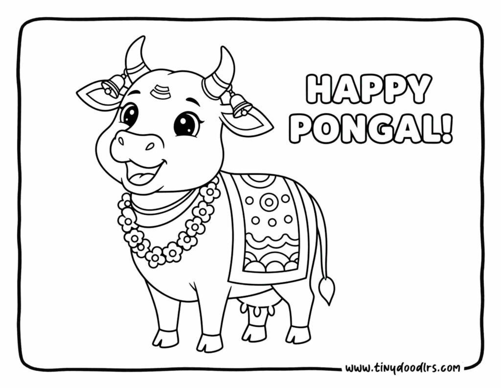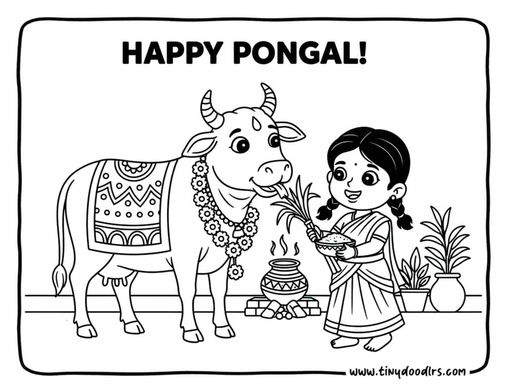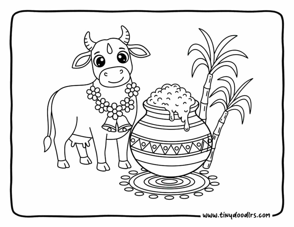 This beautiful pongal drawing highlights the sacred role of cows during the pongal festival. The decorated cow with flowers and painted horns is a favorite pongal drawing easy for kids idea.