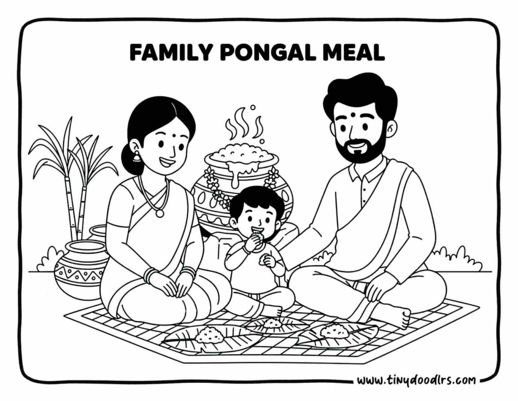 9. Parents and Child Sitting on Floor Eating Pongal Meal