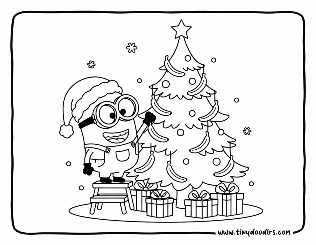 6. Playful yellow minion decorating a tree with bananas as ornaments