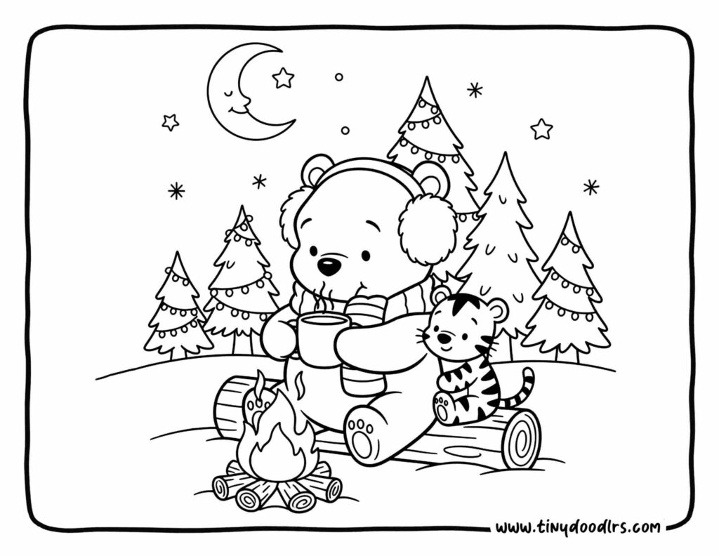 13. Curious little bear cub wearing earmuffs and sipping cocoa near a campfire